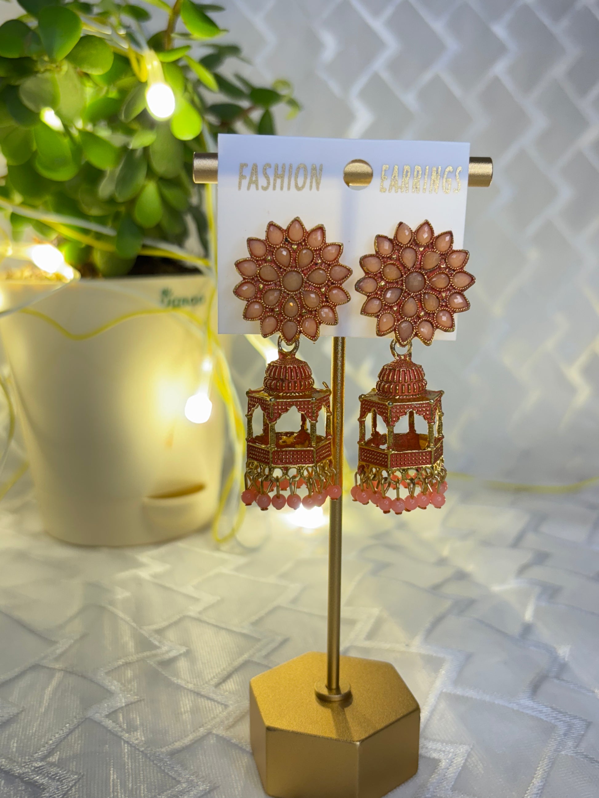 Elevate your festive wardrobe with the Jharoka Style Floral Jhumka, designed to complement kurtis and traditional attire effortlessly. These lightweight earrings blend classic charm with Gen Z aesthetics, making them ideal for Rakhi celebrations and Navratri festivities. Their intricate floral design adds a delicate touch, perfect for enhancing your ethnic look while ensuring comfort throughout your celebrations.