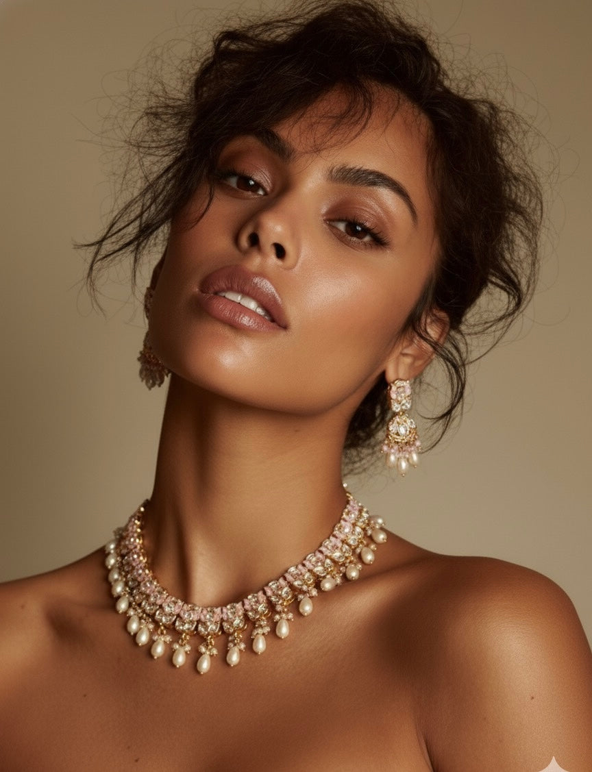 This Pink White Kundan Necklace Set features a stunning pink kundan heavy necklace with pearl imitation jewelry. The luxurious design and expert craftsmanship of this set make it a standout piece for any special occasion. Enjoy the elegant and timeless beauty of this necklace set.