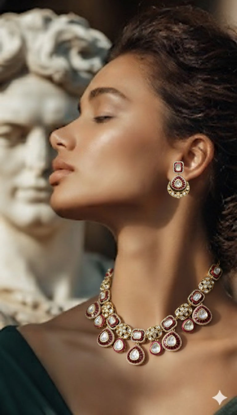 A regal rani pink Kundan necklace set crafted to add grace and grandeur to your special moments.