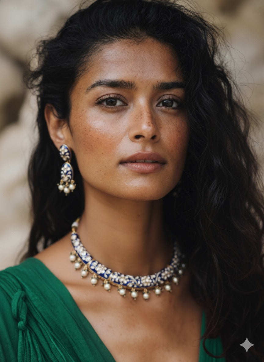 Experience the elegance of our Royal Blue Hasli Necklace Set. Handcrafted with exquisite Kundan and Meenakari work, this stunning piece is sure to elevate any outfit. The rich blue hue adds a regal touch, making it a must-have for special occasions. Make a statement with this unique and intricate design.